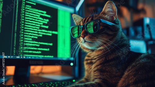 The watermark will not be included on Wall mural.: Cat with glasses sitting in front of a screen with a code