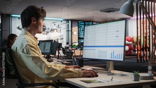 The watermark will not be included on Wall mural.: Caucasian male manager using desktop computer with analytics software wth financial reports - man wor