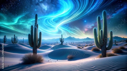 Wall mural celestial dance: glowing cacti and spiraling digital dunes generative ai