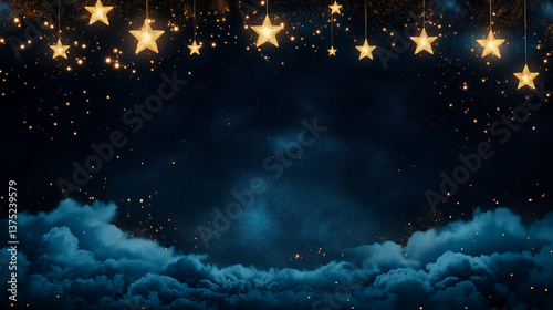 The watermark will not be included on Wall mural.: Celestial dreamscape: a mesmerizing scene unfolds with twinkling golden stars suspended against a de
