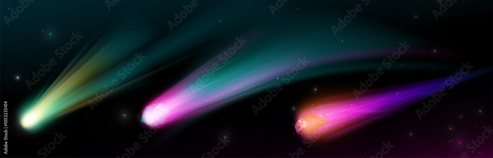 Wall mural celestial objects - asteroids or comets streaking across space with vibrant fire tails. realistic 3d
