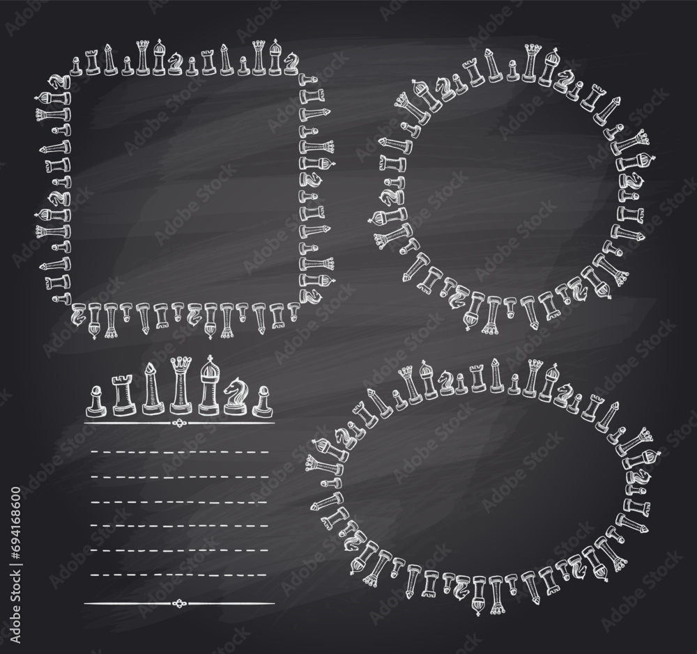 Wall mural chalk chess frames set on a chalkboard with chess figures and place for text
