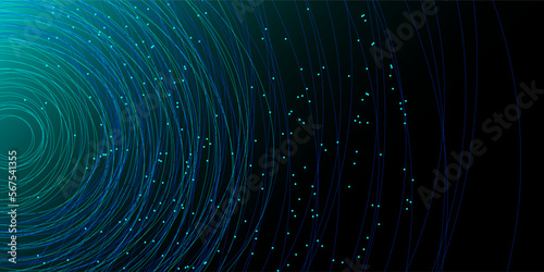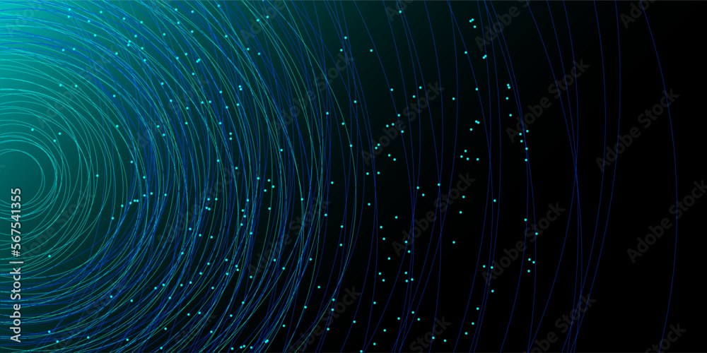 Wall mural chaotic interweaving of lines and dots on a black background. technological background for design on