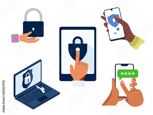 Characters holding smartphone laptop typing two factor authentication code pin verify security accesWall mural