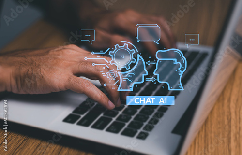 Wall mural chat with ai, artificial intelligence. adult man chatting with a smart ai or artificial intelligence