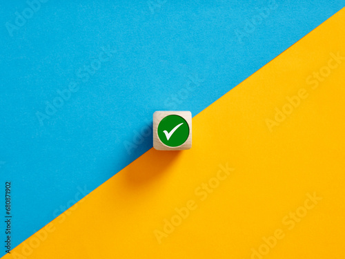 The watermark will not be included on Wall mural.: Check mark on a wooden cube push button -