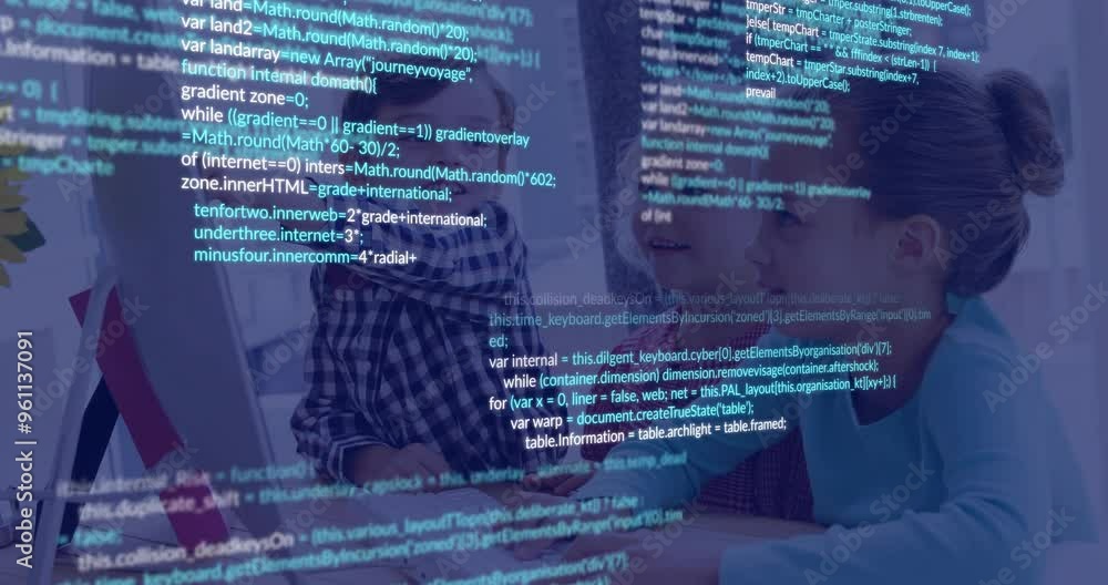 Wall mural children using computer with programming code animation over screen - Wall murals Wall mural children using computer with programming code animation over screen - Wall murals