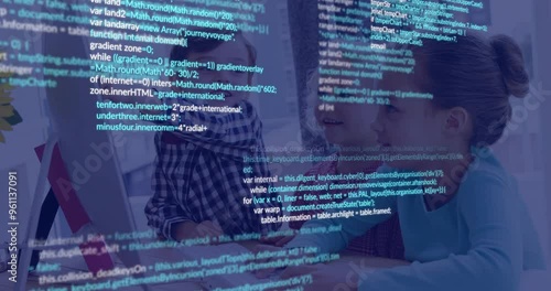 The watermark will not be included on Wall mural.: Children using computer with programming code animation over screen