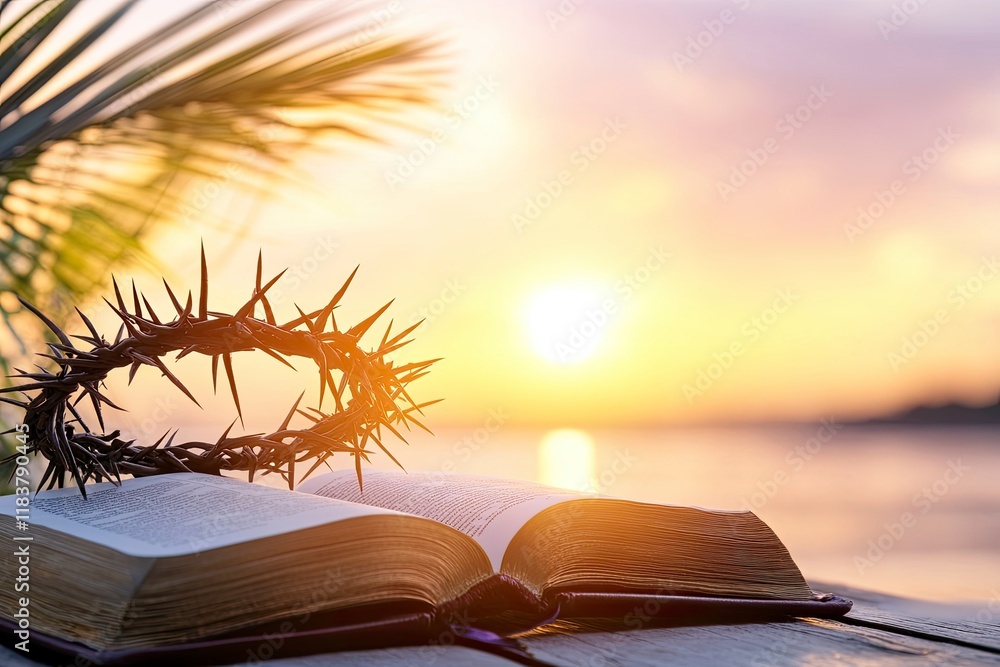 Wall mural christian cross and open book with a crown of thorns with a sunset scene background. palm sunday con