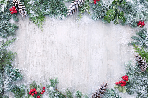 Wall mural : Christmas and new year background with fir branches and snowfall on wooden white board