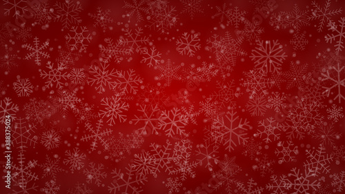 Wall mural christmas background of snowflakes of different shapes, sizes and transparency in red colors