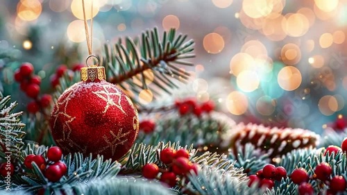 Wall mural christmas balls on the branches of a fir tree on a background of golden bokeh. - Wall murals Wall mural christmas balls on the branches of a fir tree on a background of golden bokeh. - Wall murals