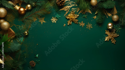 Wall mural : Christmas branches and decorations on green background with copy space created with generative ai