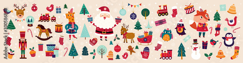 The watermark will not be included on Wall mural.: Christmas decorative banner with funny santa claus, nutcracker, locomotive and gift boxes and many o