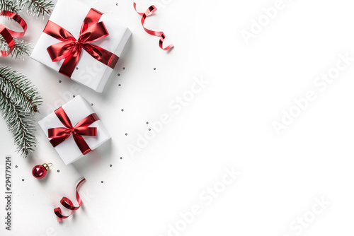 Wall mural christmas fir branches with gift boxes with red ribbon on white paper background with bokeh, light.