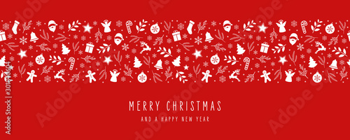 Wall mural : Christmas icon elements border decoration card with greeting text seamless pattern red background -