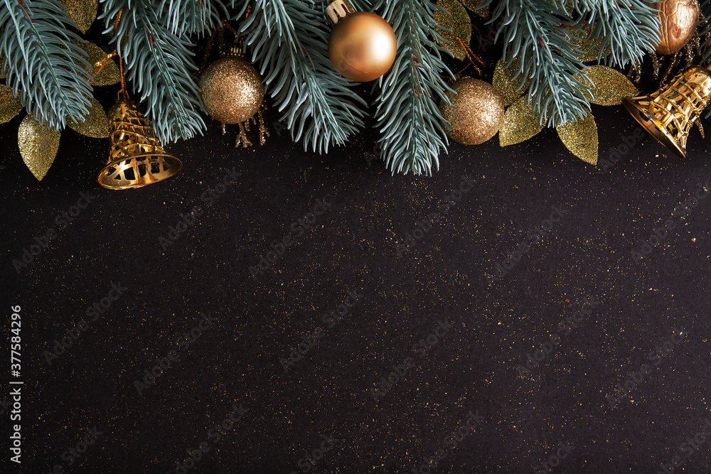 The watermark will not be included on Wall mural.: Christmas layout with christmas trees, gold baubles and bells on a black background with copy space -
