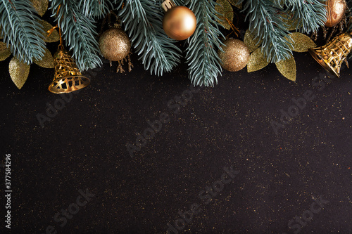 Wall mural : Christmas layout with christmas trees, gold baubles and bells on a black background with copy space -
