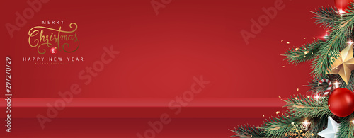 Wall mural christmas tree background and red shelf on the wall for display .merry christmas text calligraphic l