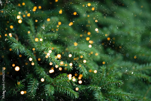 Wall mural : Christmas tree branches with a garland against falling snow -
