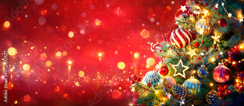 Christmas tree in red shiny glittering background - baubles hanging on fir with abstract lightsWall mural