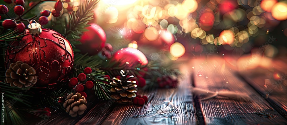 The watermark will not be included on Wall mural.: Christmas tree ornaments on a wooden background - copy space image - place for adding text and design