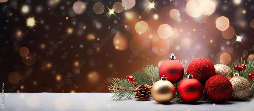 Wall mural : Christmas tree twigs cones balls and bokeh create a festive holiday background with an appealing cop
