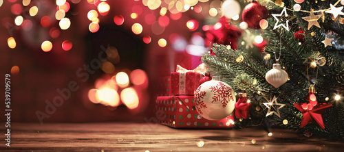 The watermark will not be included on Wall mural.: Christmas tree with decorations near a fireplace with lights