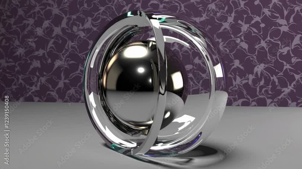 Wall mural chrome sphere rotating inside two glass spheres on a floral background, creating an abstract and mod - Wall murals Wall mural chrome sphere rotating inside two glass spheres on a floral background, creating an abstract and mod - Wall murals