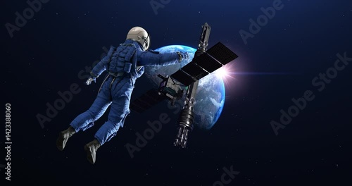 The watermark will not be included on Wall mural.: Cinematic space flyby past astronaut toward planet earth and space station - space and technology rel