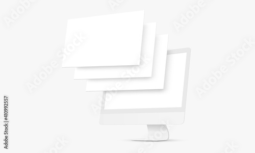 Wall mural clay computer monitor mockup with blank wireframing pages. concept for showcasing web-design project