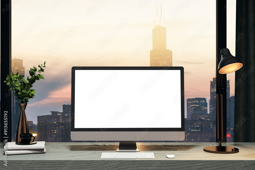 Wall mural clean designer office interior with empty white mock up computer screen. panoramic window with city  - Wall murals Wall mural clean designer office interior with empty white mock up computer screen. panoramic window with city - Wall murals