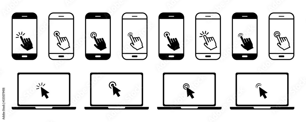 Click computer mouse on screen laptop and hand touch on screen smartphone - cursor and laptop - fingerWall mural