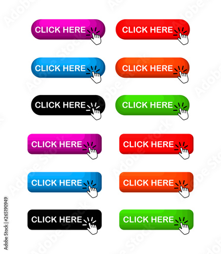 Wall mural click here colorful button set. icons web isolated on white background. vector illustration.