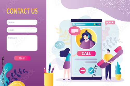 Wall mural clients call support service. customers communicate with operator on hotline. contact us form templa