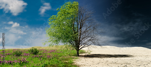 Climate change concept - tree in two parts with green and healthy nature versus drought and polluted Wall mural