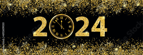 The watermark will not be included on Wall mural.: Clock 2024 golden sand particles snowflakes header