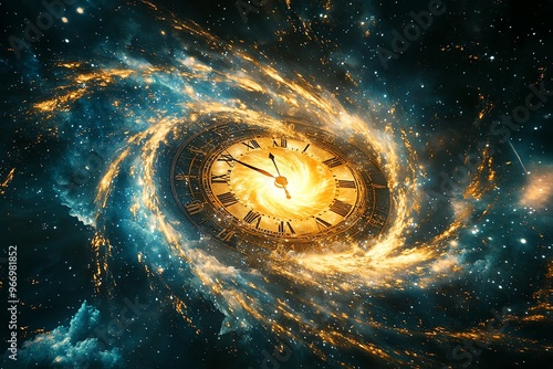 The watermark will not be included on Wall mural.: Clock face embedded in swirling galaxy, representing time and space -