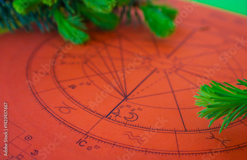 The watermark will not be included on Wall mural.: Close uo of printed red astrology chart with small fir tree branches in the background