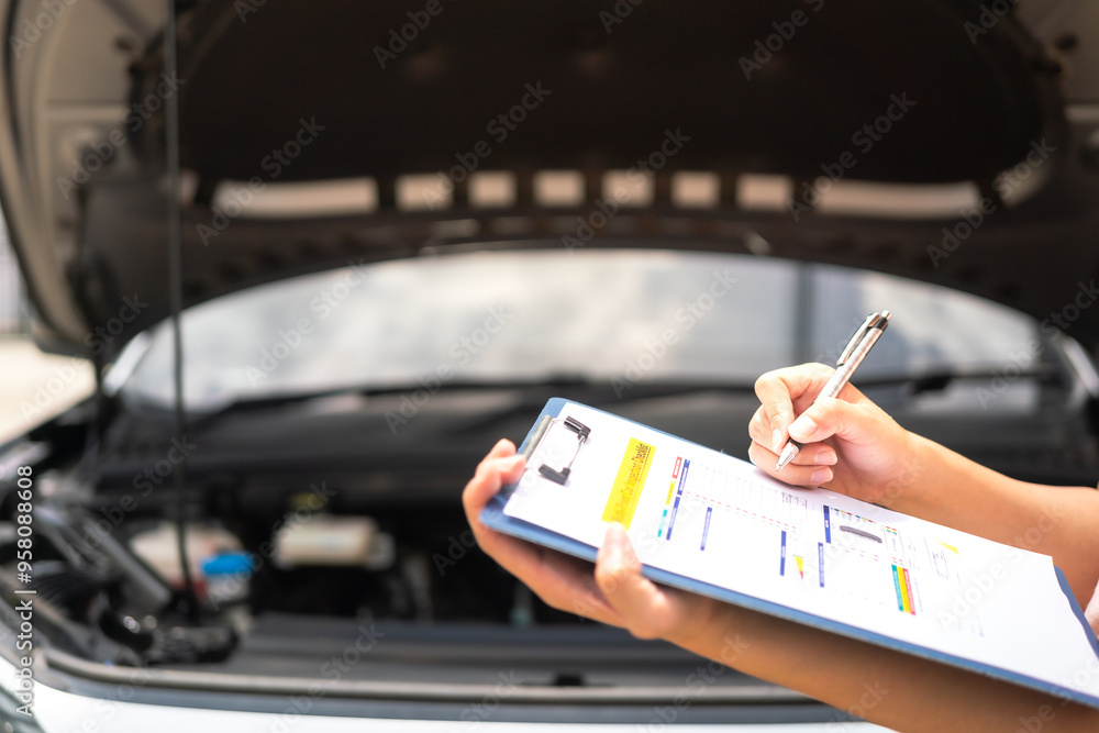The watermark will not be included on Wall mural.: Close-up at a mechanic foreman's hand is checking on multi-point car service guideline checklist for