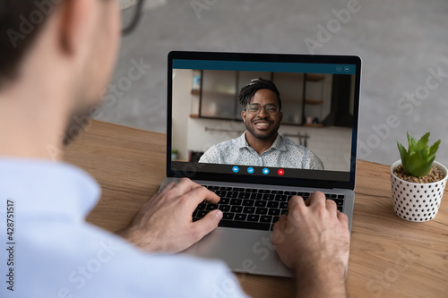 Wall mural close up back view of man use laptop talk on video call with smiling african american business partn