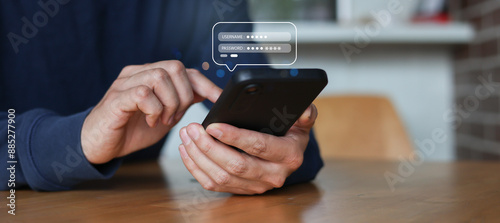 The watermark will not be included on Wall mural.: Close up customer man hand use smartphone and type username with password to log in private account