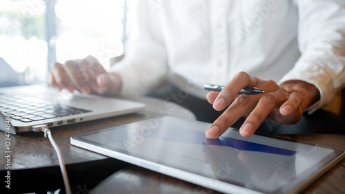 Close up executive hand use pencil to check and write about summary report annual and quater with viWall mural