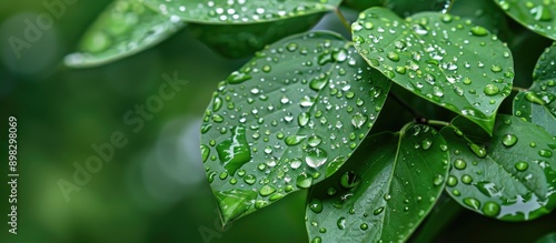 Wall mural : Close up focus on dew covered green leaves in a forest setting with copy space image available