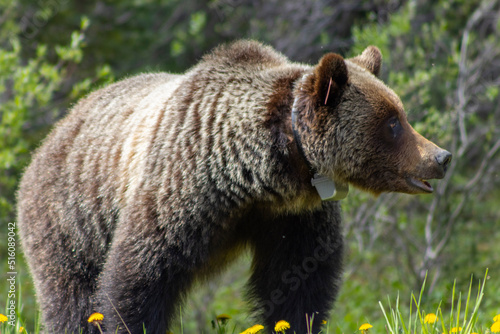 The watermark will not be included on Wall mural.: Close up grizzly bear with tracking devise and ear tag