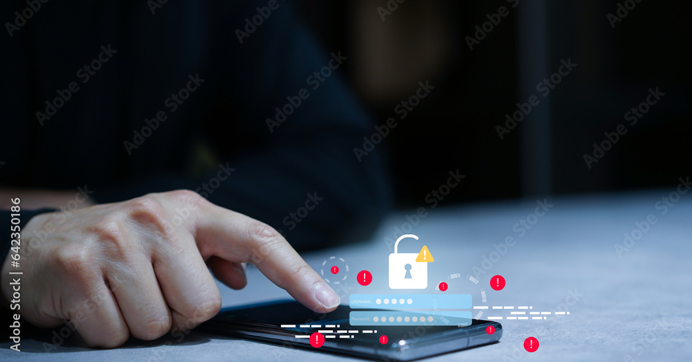 Wall mural close up hacker man hand use smartphone to unlock on privacy account system to steal data informatio