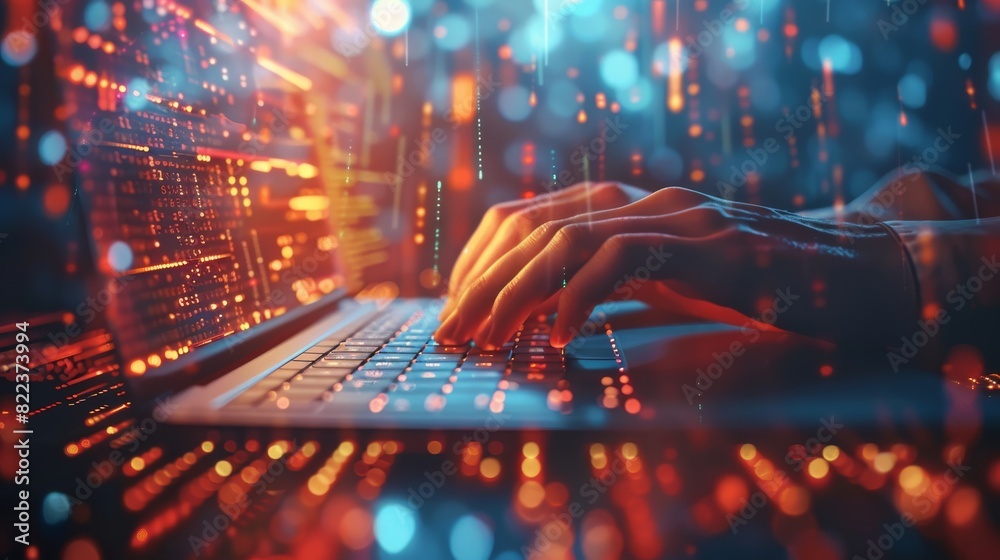 Wall mural close up hands of a businessman typing on a laptop keyboard with a glowing data and code background, - Wall murals Wall mural close up hands of a businessman typing on a laptop keyboard with a glowing data and code background, - Wall murals