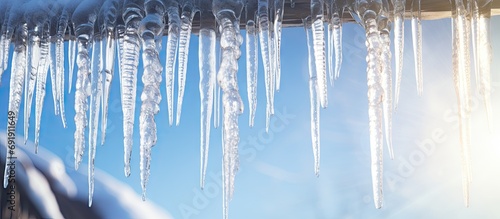 The watermark will not be included on Wall mural.: Close up icicles hanging from the waves of the roof - copy space image - place for adding text