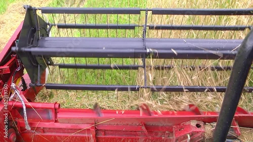 The watermark will not be included on Wall mural.: Close up knife of combine spinning and cutting yellow ears of wheat - farm implements: closeup of a g