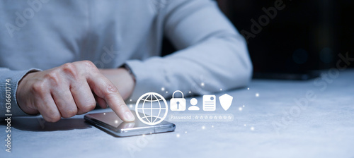Wall mural close up man hand use digital tablet to access account on social media network website with virtual  - Wall murals Wall mural close up man hand use digital tablet to access account on social media network website with virtual - Wall murals
